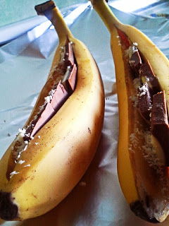 Banano z olupkom vred po dolžini prerežemo. V odprtino nadevamo čokolado in posujemo s kokosom. Banane zavijemo v folijo in jih damo v pečico. Tam jih pečemo 15 minut na 180 stopinjah.