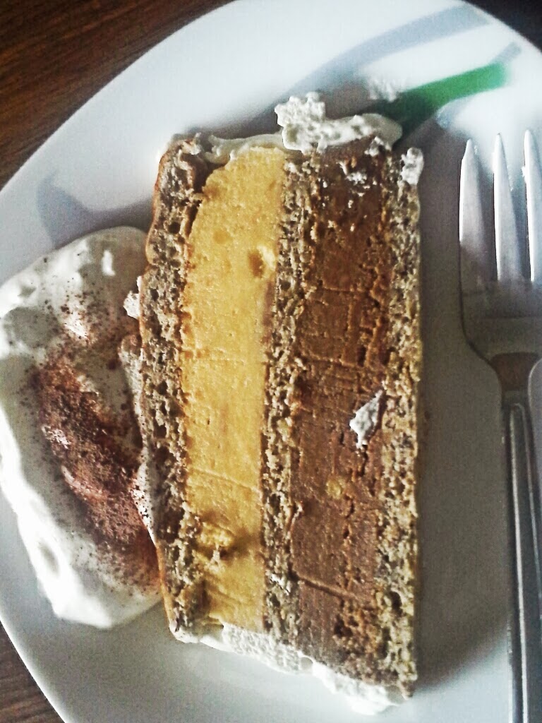 Najprej damo plast biskvita, nato belo polovico kreme, drugo plast biskvita, čokoladno kremo in na koncu še zadnjo plast biskvita.