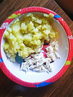 Olupimo krompir in bučko, ju narežemo na kocke in ju kuhamo približno 15 minut. Pretlačimo ju z vilico. Zraven dodamo koščke ribjega fileja, ki smo si jo prisvojili z maminega krožnika. Bodimo zelo previdni pri filiranju.