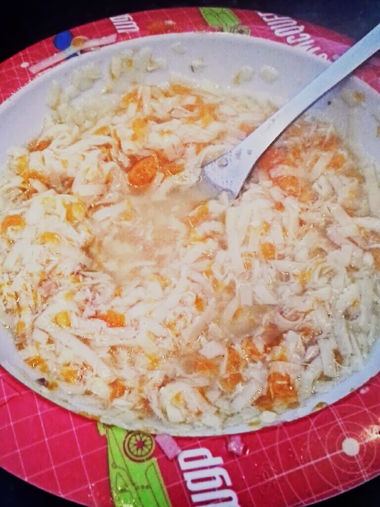 Vzamemo dve zajemalki v prejšnjem blogu kuhane juhice. Vanjo dodamo par koščkov korenčka jaz sem vzela 3 četrtinke in natrgamo meso s kurjih vratov. Vse skupaj premešamo in župika je pripravljena.