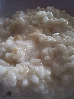 V vodo damo 4 žlice riža in ga kuhamo vsaj 20 minut. Pustimo, da se je čisto mehek. Nato ga odstavimo in mu dodamo adaptirano mleko. Če smo adaptirano mleko že zamenjali s “pravim”, ga damo namesto vode. Dodamo polovico banane in jo z vilico pretlačimo ali pa samo natrgamo na koščke in pomešamo z rižem. Ohladimo in postrežemo.