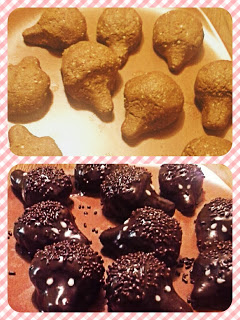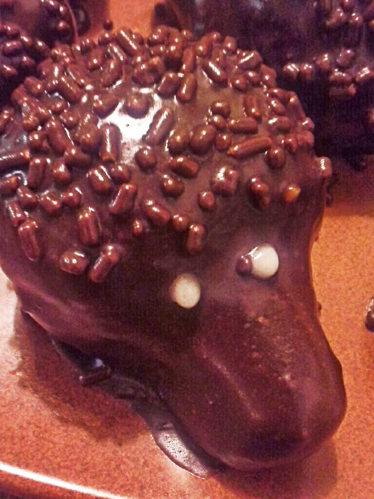 Za glazuro stopimo margarino in ji dodamo čokolado, čokolado v prahu in vodo, da dobimo tekočo čokolado. Ježke vzamemo iz hladilnika in jih pomakamo v čokoladno zmes.Položimo jih na krožnik in jih potresemo z mrvicami, razen po “smrčku”, kjer pustimo samo gladko čokolado. Ježke damo v hladilnik, da se čokolada strdi, nato jih vzamemo ven in jim narišemo oči. Oči narišemo z zobotrebcem iz mase sladkorja v prahu in par kapljic limoninega soka, da dobimo srednje gosto kremo. in ježki so gotovi. Najbolje je, da jih damo še za par ur v hladilnik, čeprav priznam, da se je težko upreti 😉