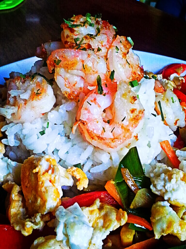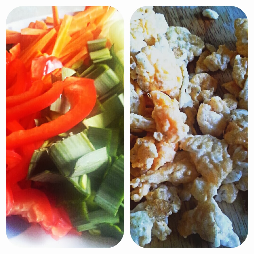 V rahlo soljeni vodi skuhamo riž in ga ohladimo. Če želimo, da se nam jajce ne zdrobi in zgubi v jedi, ga moramo speči v naprej. Obe jajci zlijemo v vok in jih spečemo kot za “umešana” jajca. Jajca odstranimo, vok pa pustimo na ognju in dolijemo malo olja. Če imamo doma sezamovo ali še bolje arašidovo olje ju uporabimo, drugače pa bo z olivnim prav tako dobro. Prepražimo rakce, ki ne rabijo več kot 2 do 3 minutke na vsaki strani. Oziroma, da postanejo lepe oranžne barve (lahko tudi že malo na rjavo, ko so lepo zapečeni). Odstranimo jih z voka in na vroče olje stresemo še zelenjavo. Pražimo 5 minut, da zelenjava ostane še hrustljava. Prilijemo malo sojine omake (jaz sem dodala svetlo, da ni obarvala riža). K zelenjavi dodamo rakce in jajca in vse skupaj premešamo, solimo in popramo.