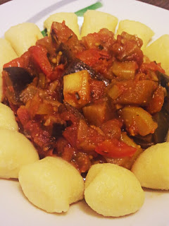 3 žlice ratatuja, ki smo ga skuhali za nas. (Jaz sem ga vzela stran, preden sem dodala vino).