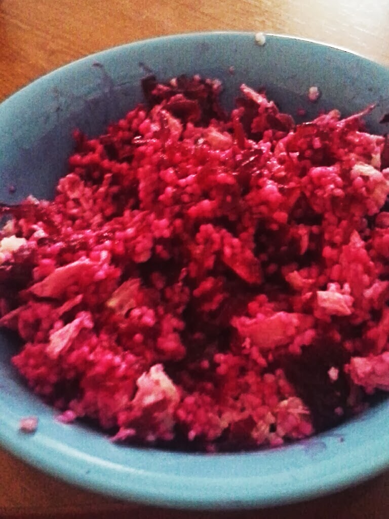 V kozico damo meso in ga pustimo 5 do 10 minut, da vre, nato mu dodamo kuskus. Pustimo še par minut, da se kuskus skuha. V krožniček naribamo rdečo peso. Dodamo kuskus im meso. Jaz meso dodatno natrgam na čisto majne koščke. Lahko pa v gladko kašico vse skupaj zmiksamo s paličnjakom.