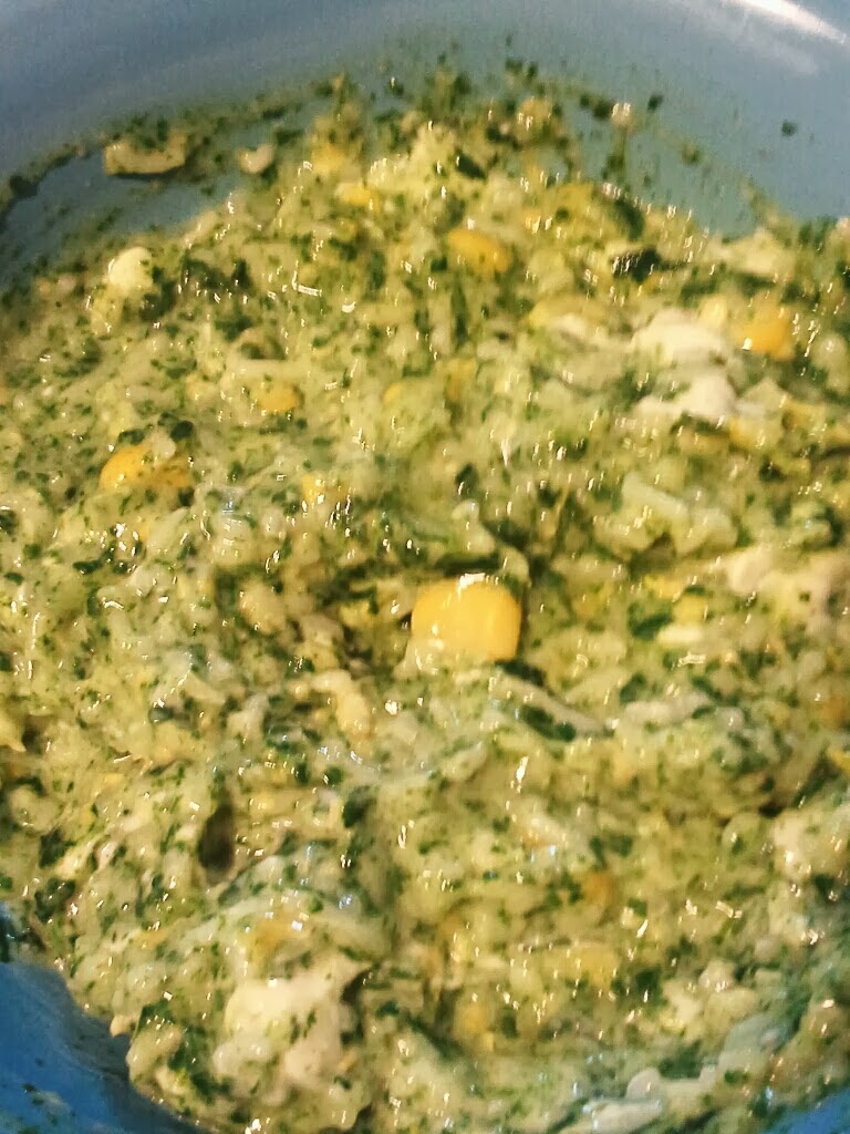 V rahlo osoljeni vodi skuhamo špagete in jim dodamo še špinačo. Kuhamo 15 minut in vse skupaj precedimo. Dodamo koruzo in zmešamo s paličnim mešalnikom. Na koncu dodamo še topljeni sirček in kosilo je gotovo.