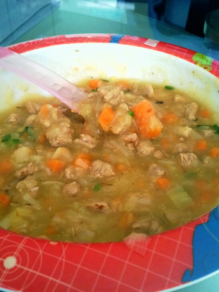 Na olivnem olju prepražimo meso in mu dodamo krompir por in korenje. Kuhamo 15 do 20 minut, dodamo peteršilj, pretlačimo in kosilo je gotovo.